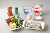 <衣>の小麦粉をアナゴ、シイタケ、レンコンに薄くからめる。