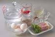 <たれ>の材料をひと煮立ちさせ、冷ましておく。冷めればジュンサイを加える。