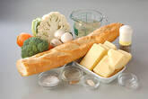 フランスパンは2cm角に切り、表面を少し乾燥させておく。オーブンの余熱で乾燥させてもOKです。