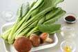 ボウルに<和えダレ>を合わせ、青菜、シイタケをサッと和え、器に盛る。