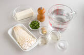 鍋に<スープ>を入れて強火にかけ、煮立てばエノキ、豆腐を加える。