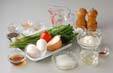 残っている生地に卵1個を割り、混ぜ合わせ、半量を万能ネギ全体に回しかける。赤ピーマンを加え、残りの生地を全体に回しかける。