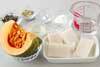 カボチャは種を取り、水に通しふんわりとラップをかけ電子レンジで7~8分加熱し、柔らかくして皮を取る。