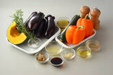 天板にオーブンシートを敷き、薄くオリーブ油を塗る。カボチャを並べ、ナス、パプリカ、ズッキーニは切り口を下にして並べ、ローズマリーを添えてオーブンに入れる。