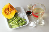 鍋にカボチャ、だし汁、<調味料>を加え、落とし蓋、鍋の蓋をして強火にかける。煮立てば火を弱め、15分煮る。