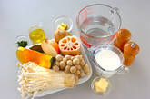 鍋にバターを入れ中火にかけて玉ネギがしんなりするまで炒め、レンコン、カボチャ、エノキ、シメジを炒め合わせる。