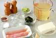 鍋にだし汁、<調味料>を加えて強火にかけ、再び煮立てばささ身、豆腐を加える。豆腐が温まればワカメ、刻みネギを加えて火を止める。お椀によそい、おろしショウガを加える。