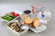 エビは殻と背ワタを取り、塩水でサッと洗い、水気を拭き取り、<衣>の小麦粉を薄くつける。