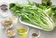 貝われ菜は根元を切り落とし、水洗いして3等分の長さに切り、水菜と合わせて冷水に放つ。