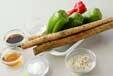 ゴボウはたわしできれいに水洗いして、3cmの長さに切り、ピーマンの太さに合わせて切り、水に放ってアクを抜く。