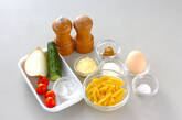 鍋に塩、水、卵を入れ中火にかける。煮立ったらマカロニを加え、袋の指定時間ゆでる。卵は水に取り、冷めたら殻をむき、フォーク等で粗くつぶしておく。