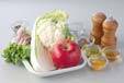 白菜はリンゴに合わせて葉はザク切りに、白い部分はそぎ切りにして、冷水に放ちパリッとさせ、しっかり水気を切る。