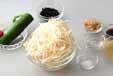 キュウリは水洗いし、斜め薄切りにして更に細切りにし、塩をからめ、しんなりすれば水洗いして水気を絞る。