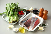 裏面も同様に焼き色がつけば、(1)のホウレン草と器に盛る。