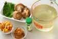 シイタケは石づきを切り落とし、軸と笠に切り分ける。軸は縦に裂き、笠は細切りにする。