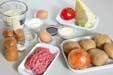 ジャガイモの粗熱がとれれば、炒めたひき肉と玉ネギ、卵、生クリームを加えて全体に混ぜ合わせ、更にナツメグ、塩コショウ、しょうゆを加え、よく混ぜ合わせる。冷凍庫で10分以上冷やす。