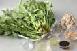 ホウレン草、菊菜は、特に根元をきれいに水洗いして、たっぷりの熱湯でサッとゆでて水に取って水気を絞り、根元を切り落とし3cmの長さに切る。