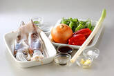 中華鍋又は大きめのフライパンにサラダ油を入れて強火にかけ、シシトウ、玉ネギ、白ネギを入れ炒める。