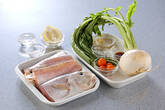 器に焼いた白甘鯛を盛り、レモン、汁気を少し絞った<カブの酢の物>を添える。