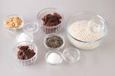 丸めた粒あんを1のもち米でで包み込み、それぞれの<衣>をつける。