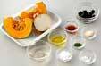 カボチャは種とワタを取り除き、5mm幅に切り、水に放つ。