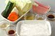 玉ネギ、キャベツ、キュウリは約3cmの長さに細切りにする。キャベツはさっとゆで、水気を切り、冷ましておく。