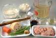 フライパンにサラダ油を中火で熱し、鶏ひき肉を加えてぽろぽろになるまで炒める。ゴボウ、ニンジン、レンコン、ショウガを加えて炒めあわせる。