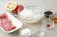 レンコンは皮をむき、縦2~4つに切り薄い半月又はイチョウ切りにし水に放ちザルに上げる。