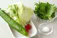 袋の空気を抜き口をしばって水が出るまで置き、水気を絞り大葉を加え混ぜ合わせ、器に盛る。