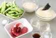 炊飯器に洗った米ともち米を入れ、<調味料>を加える。分量までの水を足し、タコ、豆を加え、昆布をのせてスイッチを入れる。