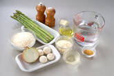更に残りの<スープ>、グリーンアスパラ、マッシュルームを加え、全体に混ぜ合わせて煮詰める。
