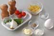 ゆで卵、キュウリを加えて混ぜ合わせ、器に盛り、プチトマトを添える。