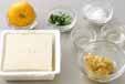 豆腐は一口大に切り、耐熱皿に並べ、電子レンジで1分位加熱し、水気を拭き取る。