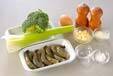 セロリは筋を引き、太い部分は半分の幅に切り、横は5mm幅に切る。ブロッコリーをゆでた湯でサッとゆでる。