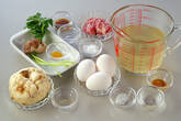 <卵液>を作る。ボウルに卵を割り、白身を切る様にほぐし、他の材料を加える。泡立てない様に混ぜ合わせ、一度固く絞ったぬれ布巾でこし、なめらかにする。
