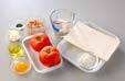 トマトは水洗いし、スプーン等でヘタをくり抜き、横に薄く切る。