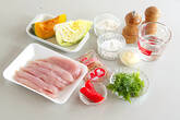 キャベツはせん切りにして水に放ち、ザルに上げる。