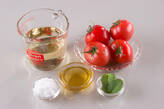 トマトはヘタをくり抜いて熱湯に入れ、皮がはじけて破れれば冷水にとって皮をむく。水気を拭き取り、十字に切り込みを入れる。