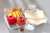 リンゴは皮をむいて横半分に切り芯をくり抜き、グラニュー糖とシナモンパウダーをからめる。