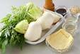 カブは葉を切り落として皮を厚目にむき、縦半分に切って横に薄切りにする。