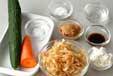 キュウリは斜め薄切りにし、更に細切りにして塩少々でもみ、しんなりすれば水気を絞る。