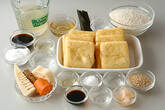 油揚げはめん棒などでコロコロ押しながら転がし、開けやすくする。たっぷりの熱湯に油揚げを入れて油抜きをし、ザルに上げ水気を切り、半分に切って袋状に広げる。(正方形の油揚は、長方形でも三角形でもお好みの形に切って下さい)