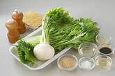 カブは皮をむき、縦半分に切って、薄い半月切りにする。