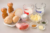 ジャガイモは皮ごときれいに水洗いし、ぬれたままラップで包み、電子レンジで5~6分加熱(途中方向を変える)する。竹串がスッと刺されば、タオル等で包みながら皮をむき、1cm幅に切る。玉ネギは薄切りにし、ベーコンは1cm幅に切り、マッシュルームは水気をきる。