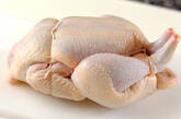 (1)の鶏肉の腹部を上にして(3)の<詰め物>を詰める。詰め終ったらおしりの部分を竹串で留め、タコ糸で縛るなどして形を整える。