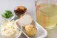 ジャガイモは皮をむいて2又は4つに切り、5mm幅の半月又はイチョウ切りにし、水に放つ。