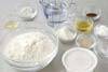 <生地>を作る。ボウルに強力粉の2/3量、スキムミルク、ドライイースト、砂糖、塩、キャラウェイシードを入れ、木べらでよく混ぜ合わせる。ぬるま湯を少しずつ加えながらよく混ぜ合わせ、粉っぽさがなくなれば(ドロドロした状態になれば)オリーブ油を加え、木べらでよく混ぜ合わせる。
