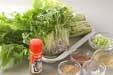 水菜は根元を切り落としてきれいに流水で洗い、3cmの長さに切り、冷水に放つ。