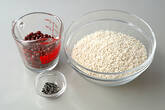 炊飯器にもち米、小豆を加え混ぜ合わせ、小豆をゆでた煮汁を炊きおこわの水位置まで加える。煮汁が足りない場合は水を足す。