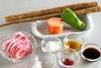 ピーマンは縦半分に切り、ヘタと種を取り除いて縦細切りにする。